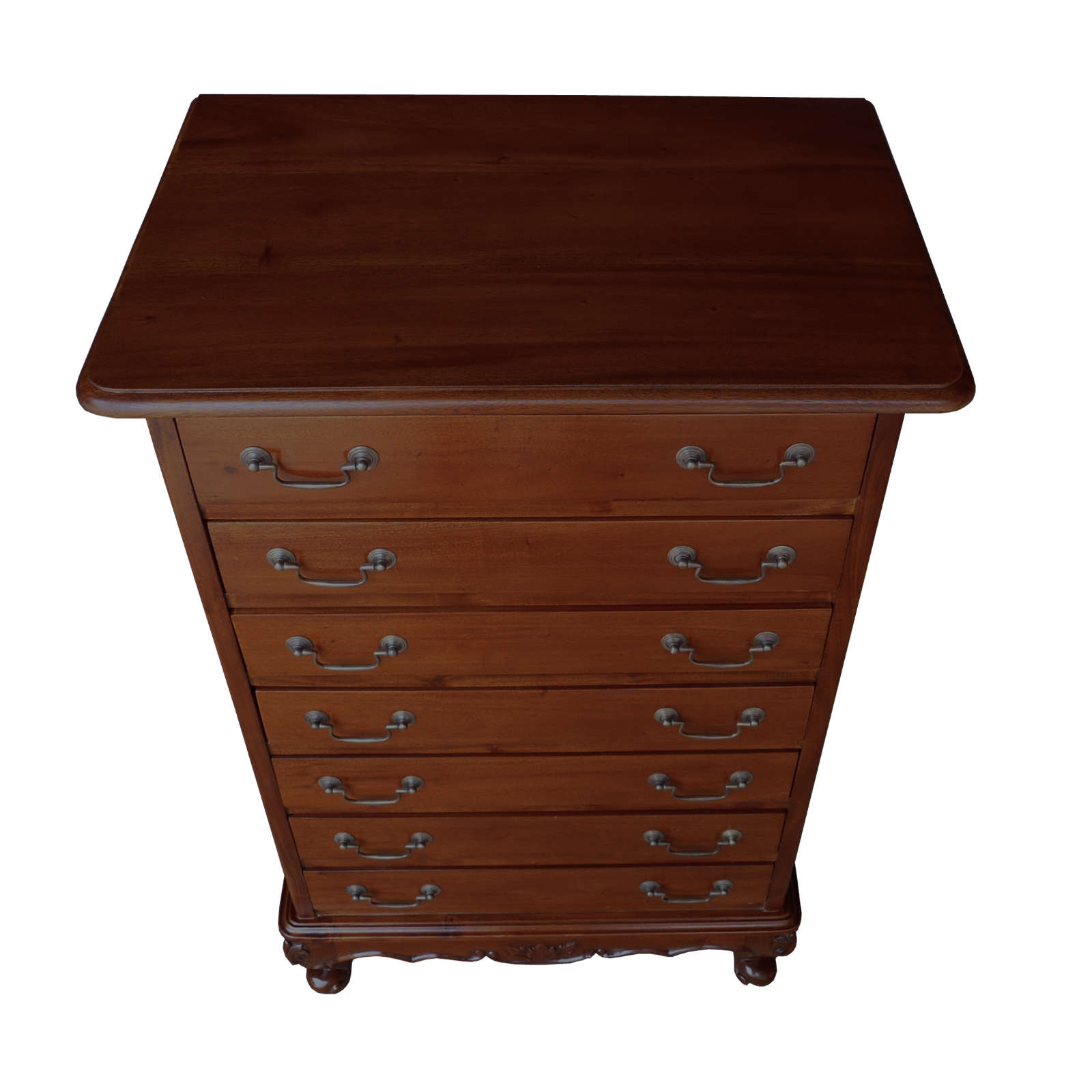French Provincial Mahogany Tallboy seven drawer chest. A really neat solution to storage problems where width is at a premium. This elegant chest matches the design features of other pieces in the French mahogany collection, with its swan neck antique brass handles and stylish cabriole legs. As with all our furniture this chest is delivered fully assembled.